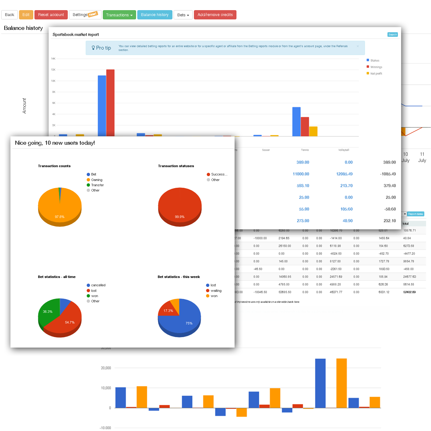 Future casino operators will have full access to our platform’s administrative panel in order to configure how the online sportsbook and casino website will operate. Some of the main capabilities of the administrative panel are listed below. But before we get into literature, let us show you one of the many super powerful white label sportsbook control panel features: the users graph.